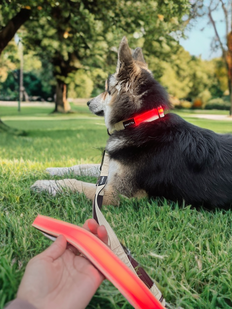 Erleuchte die Straßen mit dem LED-Set, bestehend aus leuchtendem Halsband und leuchtender Leine, sodass du und dein Fellfreund nie mehr übersehen werdet.